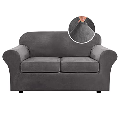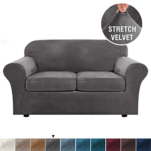 GREAT FIT: This innovated 3 Piece sofa couch cover is crafted from luxurious velvet plush fabric, including 1 piece of base cover and 2 piece of cushion covers. Loveseat slipcovers (fit sitting width between 58-72 inch). Feature one-size-fits-most, kindly measure before ordering. High recommended for both leather and cloth furniture
