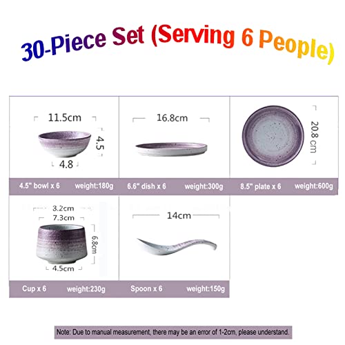 Size – 30 pieces tableware set; 4.5" bowl x 6, 6.6" dish x 6, 8.5" plate x 6, 200ml Cup x 6, Spoon x 6. To show our confidence for the package for the porcelain food grade dinnerware sets, we're committed to give you a refund or a free replacement i