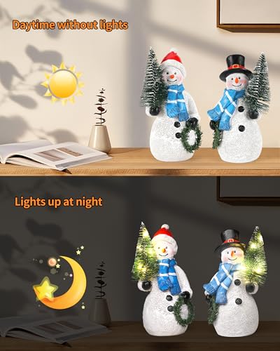 iStatue Resin Snowmen Figurines with Lighted Christmas Tree and Wreath 5'' - Set of 2 Battery Operated - Holiday Decorations Home Decor (Snowman)