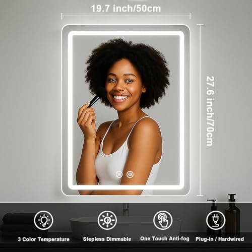 JOHALXER LED Bathroom Mirror, 20x28 in Vanity Mirrors with Backlit Lights for Shaving, Fogless Makeup Mirror Wall Mounted with Demister, Dimmable 3 Color Lighting, IP54