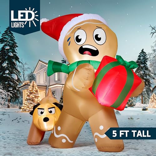 JOIEDOMI 5 FT Tall Christmas Inflatables Gingerbread Man & Dog Outdoor Decoration, Christmas Blow Ups Yard Decor Gingerbread Inflatable, Outdoor Xmas Decorations with LEDs for Garden Lawn Decor