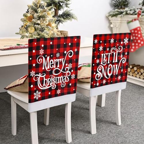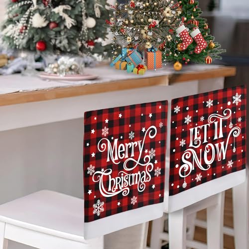 Christmas Designs: The red and black chair covers are designed with various Xmas elements,such as assorted size stars and dots,snowflakes in various shapes,wish"Merry Christmas",greeting"LET IT SNOW",which are eye-catching on the chair and bring your dining room into a happy Christmas season instantly.
