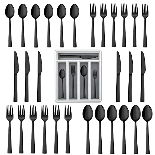 DECENT QUALITY, The black flatware set is constructed of premium stainless steel that ensures your health, Rust resistance and without any harmful substance, Sturdy constructions and durable to stand up to daily use