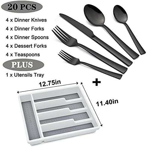 SERVICE for 4, The 20pc metal silverware set includes 4 complete place settings, Dinner Knives, Dinner Forks, Salad Forks, Dinner Spoons and Tea Spoons, plus a silverware drawer organizer, Great gift for Housewarming, Christmas, Wedding