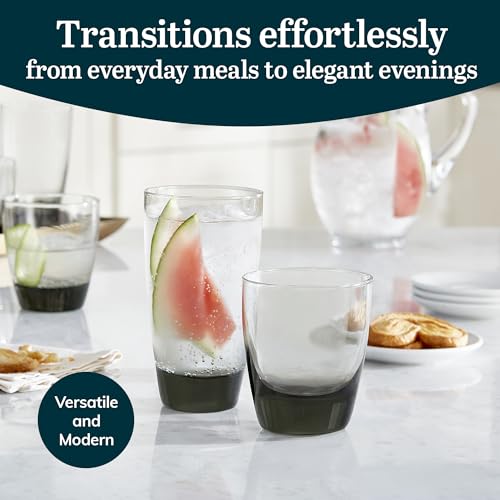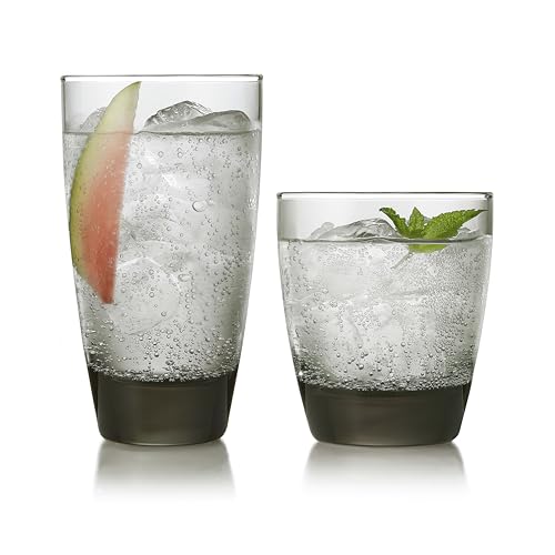 Versatile 16-piece smoke-hued drinkware set that's ideal for a wide range of cocktails — eight 18-ounce drinking glasses and eight 13-ounce rocks glasses