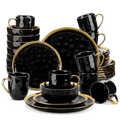 LOVECASA Black and Gold Dinnerware Sets, Stoneware Dishes Set for 8, 32 Piece Plates and Bowls Sets, Handmade Dinner Set with Gold Trim, Dishwasher Safe