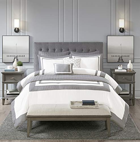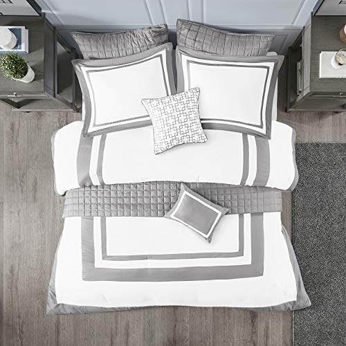 Madison Park Heritage Comforter Coverlet Combo, Color Block Design Modern Luxe All Season Down Alternative Bed Set with Matching Shams, Decorative Pillows, King/Cal King(104"x92"), Grey 8 Piece