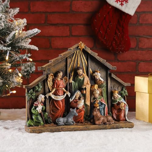 Magicsculp 11 Piece Christmas Nativity Set - 10.8" W Connected Holy Family Sculpture with Manger, Nativity Religious Tabletop Decorations, Hand Painted Resin Catholic Decor for Home Tabletop & Shelf