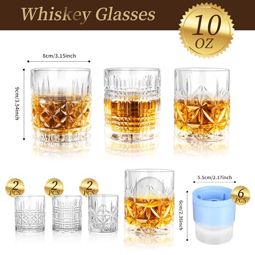 Whiskey glasses set of 6 - mixed with 3 different design glasses, Each heavy-based whisky glass holds 10 ounces, height is 3.54 inch, the diameter is 3.15 inch, and 6 Round Big Ice Ball Molds.
