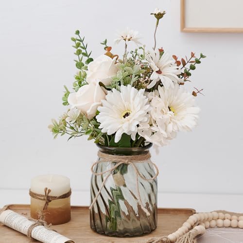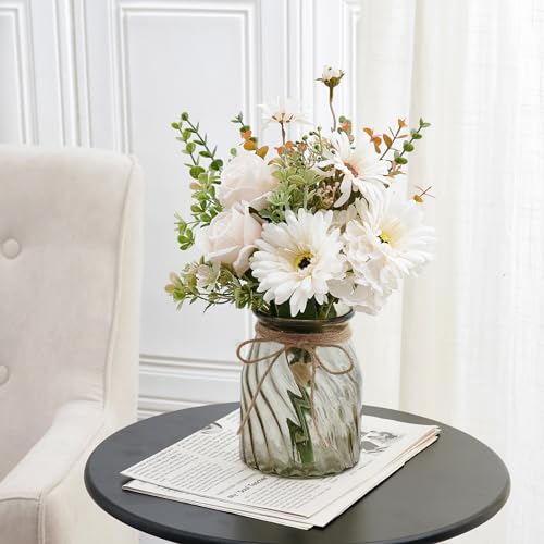 ?Artificial Flowers in Vase: The fake flower arrangements decoration suitable for coffee table decor, living room decor and fall decorations. The silk floral decor include a fake bouquet and a glass vase. The flowers composed of white dasies, light champagne roses, white hydrangea and several artificial plants. The color of the flowers is soft and bright, close to the real flowers.