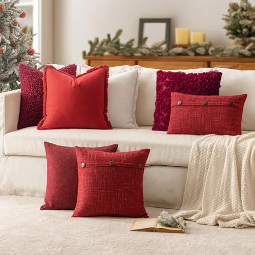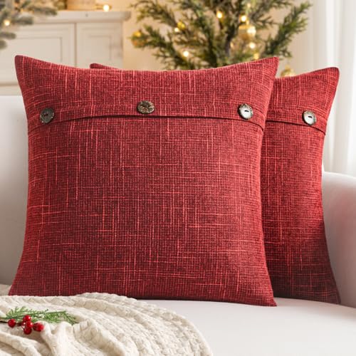 MIULEE Set of 2 Decorative Linen Throw Pillow Covers Cushion Case Triple Button Vintage Farmhouse Pillowcase for Couch Sofa Bed Decor 18 x 18 Inch Wine Red
