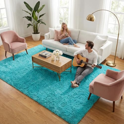 Modern Soft Fluffy Blue Shaggy Area Rug for Bedroom Boys Kids Room, Large Comfy Plush Nursery Teal Blue Carpet for Baby Boy Shower Gift Grandchildren Birthday Holiday Decor Accent Floor Rugs, 6x9 Feet