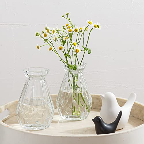 Set of 2 clear glass decorative vases with geometric faceted design, perfect for flowers and plants