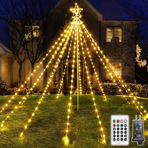 Ollny Christmas Lights Tree 340LED with Topper Star, IP67 Waterproof Remote Control Waterfall Lights with Pole, 8 Modes 3 Timers Dimmable Christmas Decorations for Outdoor Yard Garden Lawn(Warm White)