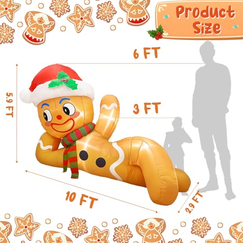 Adorable and Unique Design: OurWarm's 10FT Christmas outdoor inflatables feature an adorable gingerbread man lying down with a delightful and humorous expression. Measuring 5.5ft tall, 10ft in length, and 3ft in width, this inflatable adds a touch of whimsy and charm to your holiday decor, making it a standout piece in your yard, garden, or lawn.