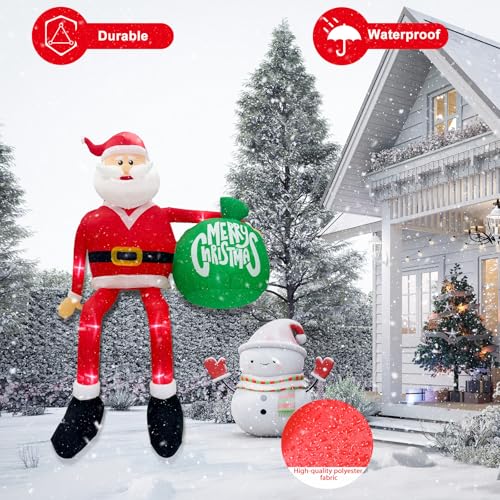 Eye-Catching Design: Standing at an impressive 14.7 feet tall. With its vibrant colors, 9 built-in LED lights, and long and slender legs design, this Santa Claus with a gift bag descends into your yard or roof, which will attract attention. Whether placed on your lawn, window sill, roof or among the trees in your yard, this Christmas outdoor inflatables with LED lights will become the centerpiece of your outdoor Christmas decorations, delighting passersby