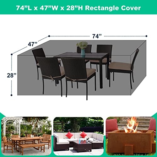 Universal Fit Furniture Cover: This outdoor sofa cover fits up to 74”L x 47”W x 28”H, designed to cover various outdoor furniture sets including round, rectangular, oval tables, chairs, sectional sofas, and fire pits, ensuring versatility for different setups