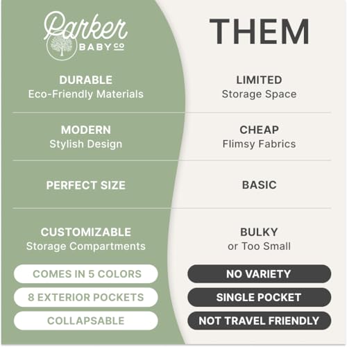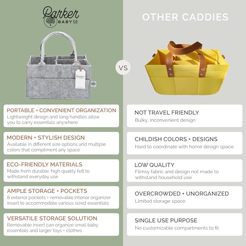 ESSENTIAL STORAGE BASKET FOR NEWBORN PRODUCTS - The Parker Baby Diaper Caddy (patented) is versatile enough for all that baby stuff: baby toys, diapers, baby clothes, baby wipes, bibs, onesies, baby toys, cloth diapers, changing pads, medicine, burp cloths and other baby essentials! Large enough for dozens of diapers and most wipes dispensers.