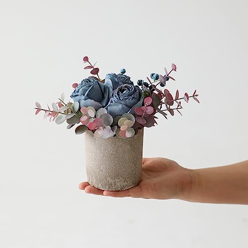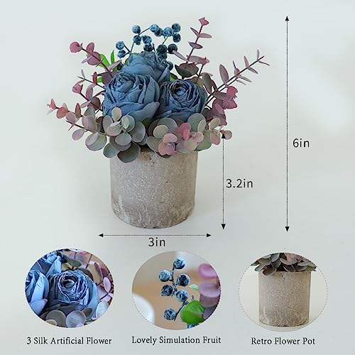 Rosscer Artificial Flowers Kit with Pot, Combination of Fake Silk Burnt Blue Roses and Greenery,Small Plant Potted Decor for Offices,Bookshelf,Bedroom, Living Room,Party,Wedding Decorations…