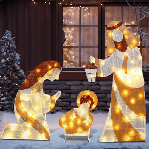Durable Material: the Christmas outdoor lighted nativity scene is made of fabric with glitter and supported by a sturdy metal frame. The light beads on the nativity scenes are strung with sturdy metal wires and wound on the sturdy metal frame, which is safe and reliable. After the power is turned on, the nativity outdoor Christmas decorations will emit lights, on the winter Christmas night
