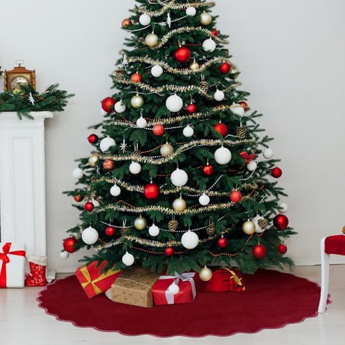 RoundFunny Burgundy Christmas Tree Skirt 48 Inches Neutral Velvet Christmas Tree Skirts Modern Scalloped Edge Xmas Decorations Minimalist Mat for Home Indoor Outdoor Holiday Party Decor