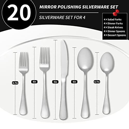 20-PIECE SILVERWARE SET: Including 4 dinner forks, 4 salad forks, 4 dinner knives, 4 dinner spoons, 4 teaspoons . Have plenty of silverware to handle even if more guests are coming to your party or dinner.