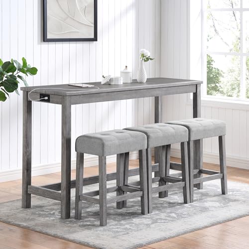 SEHAONOHOME 4-Piece Modern Dining Table Set with Power Outlet, Bar Table and Chairs for Living, Kitchen, Game Room, Gray & Gray