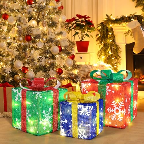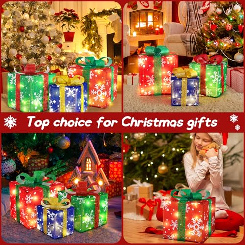 3PCS Christmas Lighted Present Boxes: You will receive 3 Christmas snowflake present boxes in three different colors: red, green and blue. Large size is 10 x 10 x 10 inches,Medium size is 8 x 8 x 8 inches,Small size is 6 x 6 x 6 inches.These lighted gift boxes are made of sturdy plastic frames, covered with high quality fabrics, decorated with cute plastic bows, suitable for indoor or outdoor Christmas decorations
