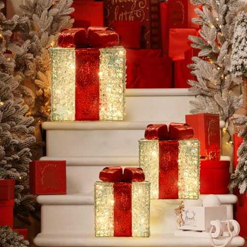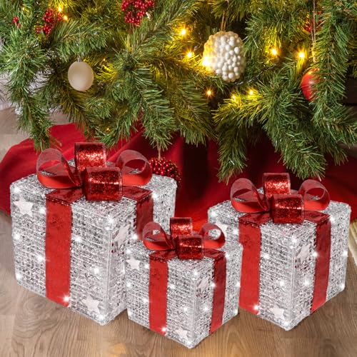 Set of 3 Christmas Lighted Gift Boxes, Xmas Silver Boxes with Red Bow, Prelit 80 LED Lights Present Boxes,Christmas Tree Ornaments Decoration for Indoor Outdoor Home Porch Decor