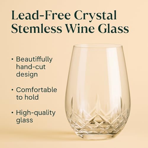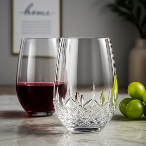 SHOSHIN - Hand Cut Stemless Wine Glass Set of 4, Large 18 oz Crystal Wine Glass, Wine Tumblers for Red and White Wine, Water Glasses, Drinking Glasses