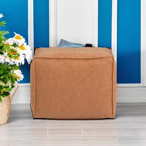 SIMPLIHOME Brody Square Pouf, Footstool, Upholstered in Distressed Brown Faux Leather, for the Living Room, Bedroom and Kids Room, Transitional, Modern
