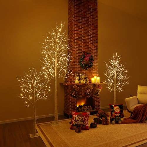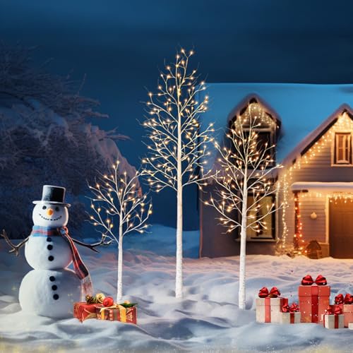 Layered Visual Impact with 3 Trees. Includes 4ft, 6ft, and 8ft prelit birch trees, creating a stunning layered display with warm white lights for indoor and outdoor christmas decorations. Ideal for front porch, garden, or living room setup