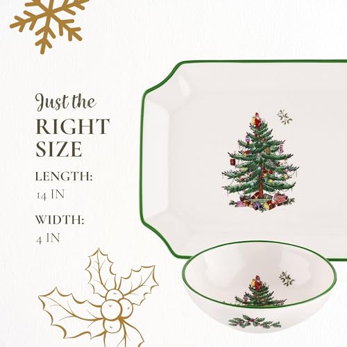 Elegant Christmas Hosting: Elevate your holiday gatherings with the Spode Christmas Tree Rectangular Tray and Dipping Bowls set. Add a touch of festive charm to your home decor as you serve sauces, nuts, candies, and condiments during the yuletide season. Create a warm, inviting atmosphere with this beautiful serveware. .