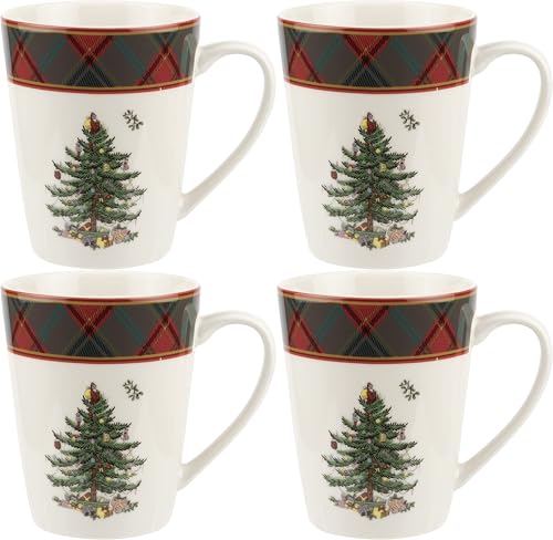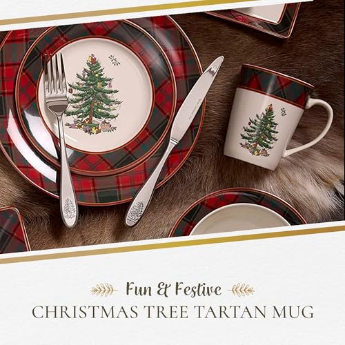 Festive Tartan Design: These stackable porcelain coffee mugs feature a traditional tartan plaid border surrounding the iconic Spode Christmas Tree, adding rustic charm to your holiday gatherings and making them a festive table addition. .