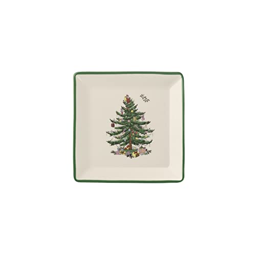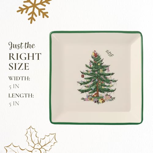 Charming Christmas Design: These Christmas Tree Tidbit Plates feature Spode's beloved festive tree motif, bringing nostalgic charm to your holiday table. Their square shape adds a modern touch to your holiday dinnerware collection. .