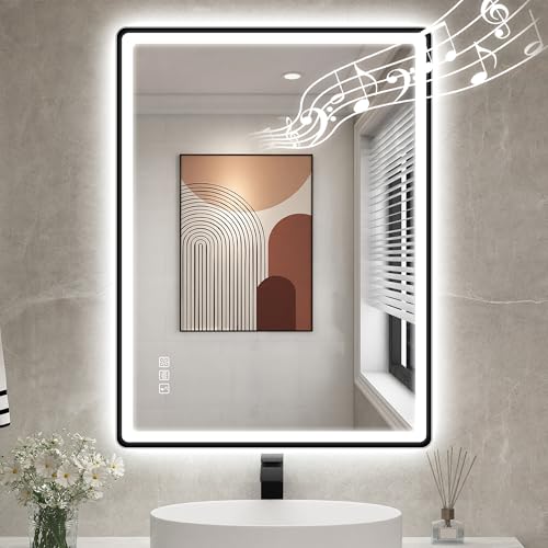 Stylish Design: 28"x36" illuminated bathroom mirror with black-coated edges; simulates a metal frame; offers a sleek yet lightweight look