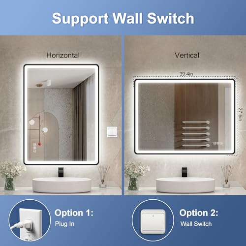 Stylish Design: 40"x28" illuminated bathroom mirror with black-coated edges; simulates a metal frame; offers a sleek yet lightweight look