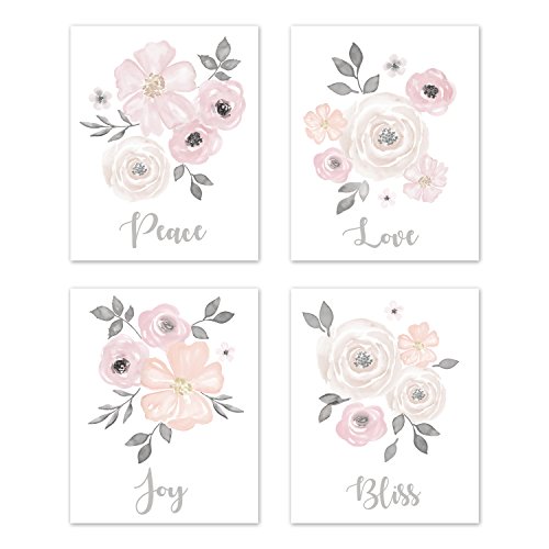 Decorative wall art print set features watercolor flowers with "Love", "Peace", "Joy", and "Bliss" quotes.