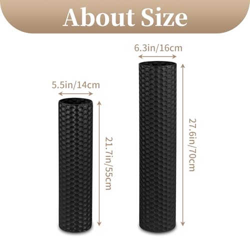 2 Heights & Wide Mouth Design: The black floor vases tanding at 27.6in and 21.7in tall. The 2 large floor vases have a wide mouth of 6.3/5.5in respectively, which can accommodate more plants for different decorative needs.Taller design for a modern look to the floor vase.In order to easy storage, the 2 sizes tall floor vase will be nested together when you receive them