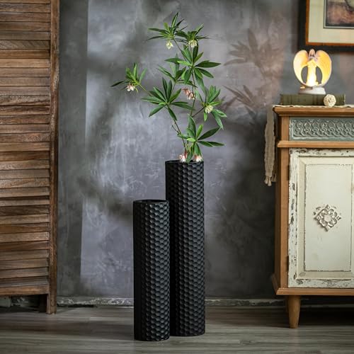 2 Heights & Wide Mouth Design: The black floor vases tanding at 27.6in and 21.7in tall. The 2 large floor vases have a wide mouth of 6.3/5.5in respectively, which can accommodate more plants for different decorative needs.Taller design for a modern look to the floor vase.In order to easy storage, the 2 sizes tall floor vase will be nested together when you receive them