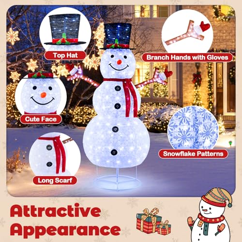 Cute Christmas Decoration: The 6 ft lighted Christmas snowman wears black hat with holly and long red scarf to bring Christmas joy to neighbors and passersby. The snowman is also designed with branch hands with gloves and snowflake patterns to seamlessly blend with the surroundings.