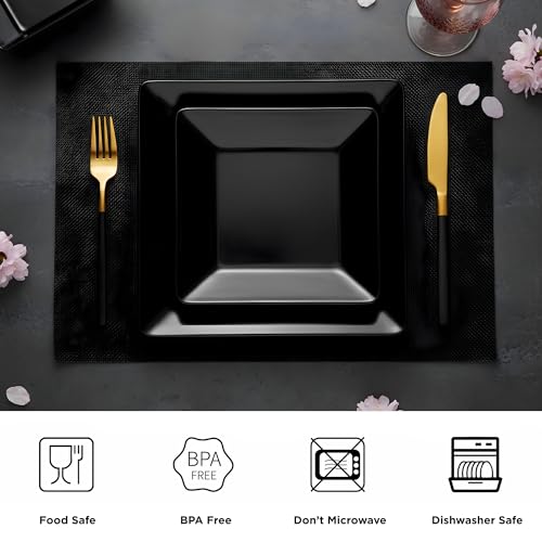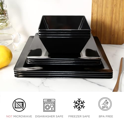 Dinner Service for 4: Highlighted with square glossy and pure black, this dinnerware set with brilliant glow includes 4 of each - 32 oz bowls, 11'' dinner plates, 9'' salad/dessert plate