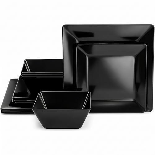 Dinner Service for 4: Highlighted with square glossy and pure black, this dinnerware set with brilliant glow includes 4 of each - 32 oz bowls, 11'' dinner plates, 9'' salad/dessert plate