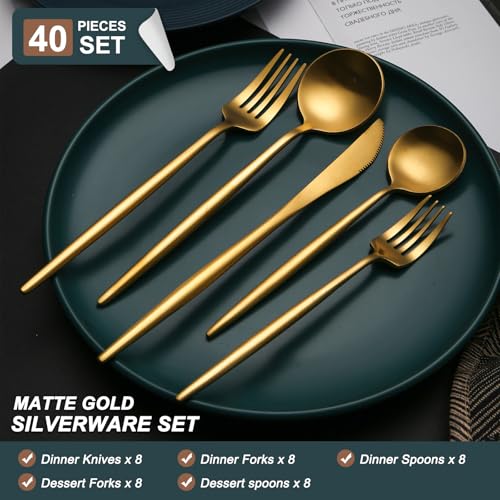 TUPMFG 40 Pieces Matte Gold Silverware Set, Stainless Steel Gold Flatware Set for 8, Satin Finish Spoons and Forks Silverware Set, Gold Cutlery Utensils Set, Dishwasher Safe