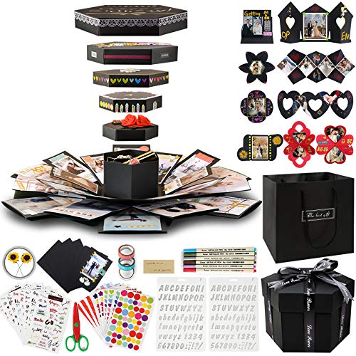 ????Size & Structure: The explosion box has five layers, the fully expanded size with 18.5 "x 18.5" and folded with 9.4"x 5.4"x4.4". The fifth innermost layer is a small gift box(4.4"x 2.8"x 2.1") to hold surprise gifts such as rings, necklaces, watches