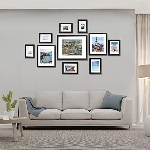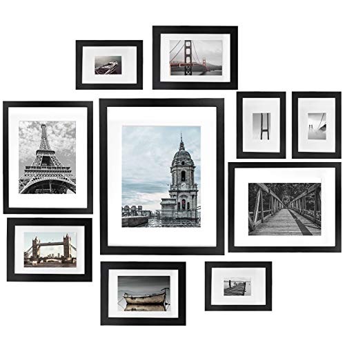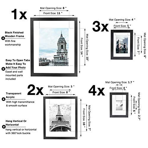 Amazing Multiple Size Picture Frames Set: This black picture frame set includes 10 piece photo frames,You will get: One piece 11" x 14" matted to 8" x 10" frames, 2 pieces 8" x 10" matted to 5" x 7" frames, 3 pieces 5" x 7" matted to 4" x 6" frames, and 4 pieces 4" x 6" matted to 1.7" x 2.7" frames. this frame is wrapped very carefully to ensure safe shipping.Don't have to worry about receiving damaged products.