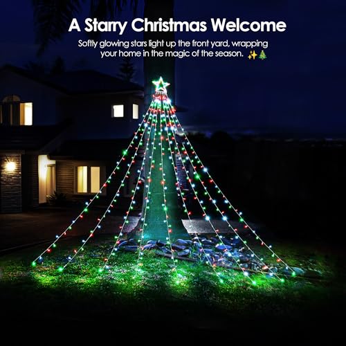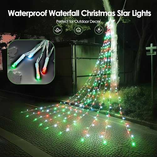 Stunning Waterfall Light Effect: Featuring a 12-inch shining star on top and 9 gracefully draped light strands, these Christmas lights create a stunning waterfall effect, transforming your home into a festive wonderland. Perfect for decorating trees, roof, walls, porches, and more!