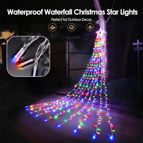 WBao Outdoor Christmas Decorations with 12" Star Topper, 344 LED 11.9ft Waterfall Christmas Lights with Remote Control, 8 Modes, 3 Timers, UL Listed, Waterproof for Tree Roof Porch Decor, Multicolor