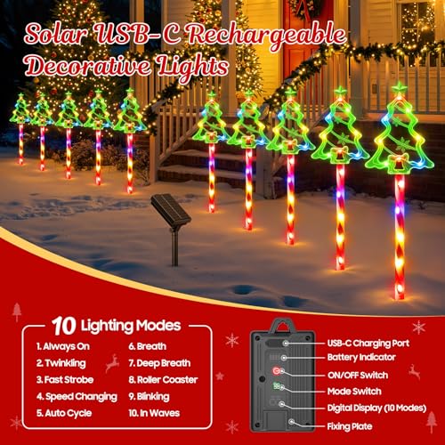 2026 Latest Outdoor Christmas Decorations: Our solar powered Christmas lights feature a Christmas tree and candy cane design. A sparkling star-shaped Christmas decoration adorns the top. They consist of 102 bright LED lights that display a variety of colors, including red, yellow, blue, and green. With 10 lighting modes to choose from, they create a cheerful and warm holiday atmosphere for any outdoor setting, including patios, gardens, yards, and paths
