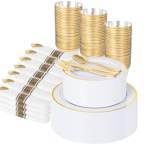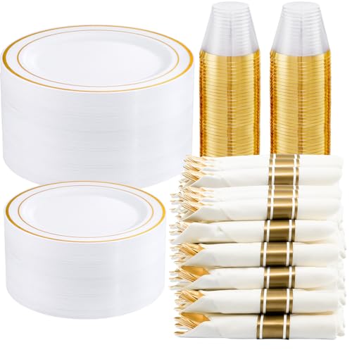 EVENT EASIER: Thanksgiving gold plastic silverware are packed in white napkins, reduce your time for folding the napkins. Gold disposable cups are protected in a clean box, you don’t need to clear up